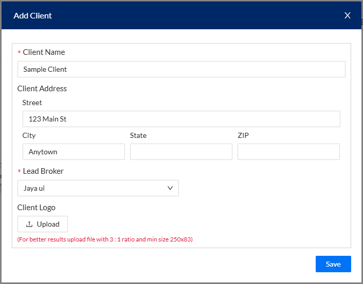 From the dropdown menu, select a Lead Broker who will be associated with this client. Additionally, upload the client’s logo according to the given specifications (such as size and format). This logo will appear in reports and throughout the system for easy identification of the client.