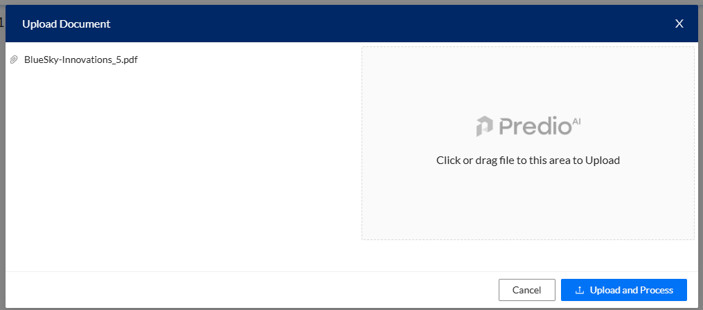 Upload and Process: Click on this option if you want PredioAI to immediately start processing the documents. This will trigger the AI to abstract key information and analyze the document content.